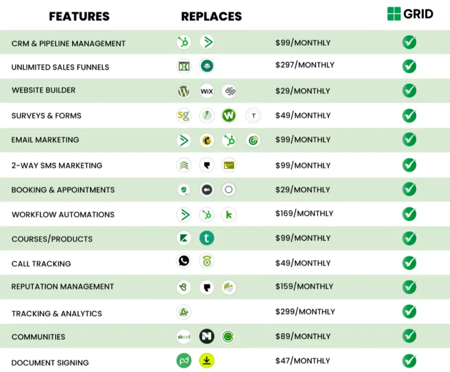 Yes. Instead of paying for separate platforms for CRM, messaging, funnels, email marketing, scheduling, invoicing, and memberships, G.R.I.D. brings all of these under one roof—saving you time and money.